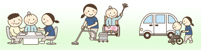 家事援助:洗濯、掃除、ごみ出し、調理、買い物、衣類の整理、被服の補修等